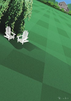 This is perhaps the final stage of the American lawn. What began as a symbol of privilege and evolved into an expression of shared values has now come to represent expedience. We no longer choose to keep lawns; we just keep on keeping them. In the meantime, the familiar image of Dad cutting the grass and then, beer in hand, sitting back to admire his work, is, in many communities, a fiction: increasingly, lawn care has become another one of those jobs, like cooking dinner or playing with the kids, that’s outsourced to someone else. When my husband and I lived in Westchester County, he used to mow our minuscule Freedom Lawn—“freedom” here being understood as just another word for nothing left to lose—himself. That he did so was not a source of pride around our house but vague embarrassment.