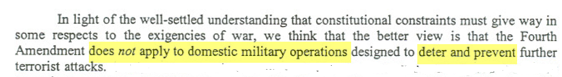 The essence of this document was to declare that George Bush had the authority (a) to deploy the U.S. military inside the U.S., (b) directed at foreign nationals andunconstrained by any Constitutional limits, including those of the First, Fourth and Fifth Amendments. It was nothing less than an explicit decree that, when it comes to Presidential power, the Bill of Rights was suspended, even on U.S. soil and as applied to U.S. citizens. And it wasn’t only a decree that existed in theory; this secret proclamation that the Fourth Amendment was inapplicable to what the document calls “domestic military operations” was, among other things, the basis on which Bush ordered the NSA, an arm of the U.S. military, to turn inwards and begin spying — in secret and with no oversight — on the electronic communications (telephone calls and emails) of U.S. citizens on U.S. soil. U.S. citizens alike; (c)