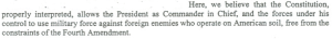 The President, when using military force against American citizens on U.S. soil, is “free from the constraints” not only of the Fourth Amendment, but also of other core guarantees of the Bill of Rights — including First Amendment liberties, Due Process rights, and the takings clause: